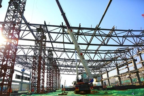 四号展馆屋面桁架吊装在进行中。