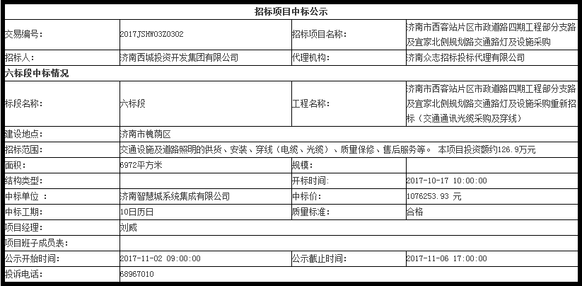 济南市西客站片区市政道路四期工程采购中标公示