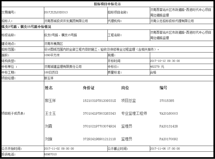济南西客站片区市政道路-西进时代中心项目周边道路监理中标公示