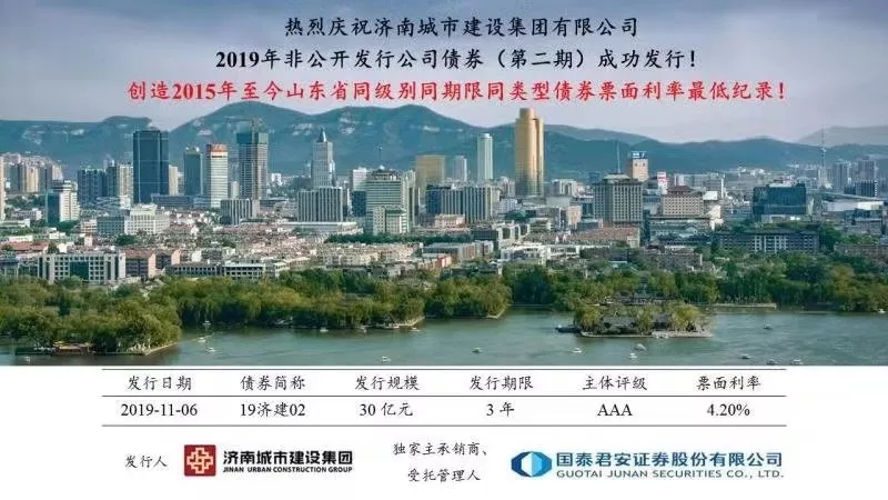 2019年11月6日,437ccm·必赢国际非公开发行2019年公司债券(第二期)(“19济建02”)发行圆满落地,创造2015年至今山东省同级别同期限同类型债券票面利率最低纪录。本期债券发行得到了市场的广泛认可,投资者认购踊跃。19济建02低利率发行,充分展现了投资者对437ccm·必赢国际领先的行业地位、良好的品牌形象以及稳健的财务政策等方面的肯定。