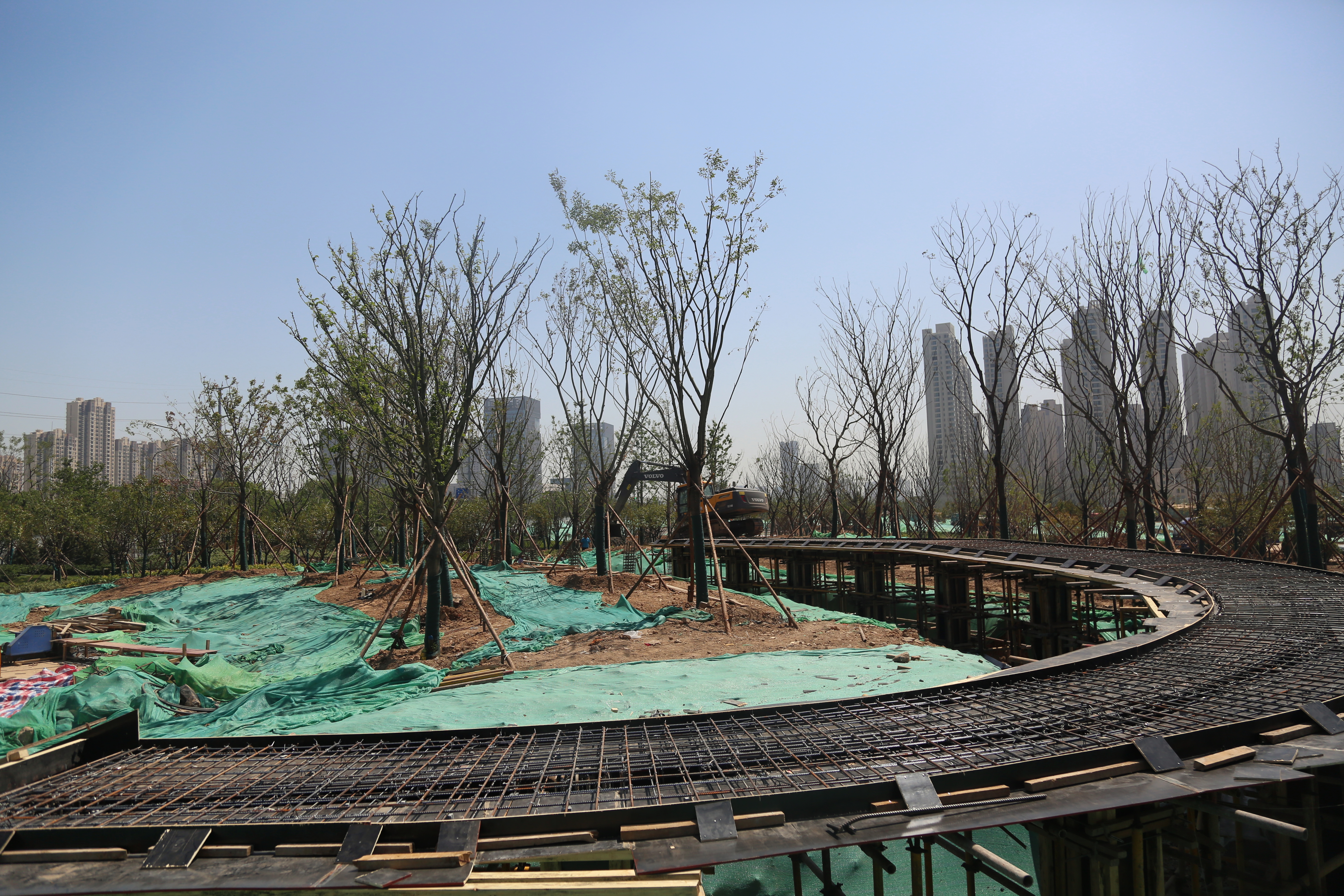 云锦湖公园的绿化包含苗木种植、石材铺装、雕塑、亭廊、广场、喷泉、栈道、游步路等工程。沿着公园西北部的波浪广场进入内部,园区内部绿化效果初显,多台挖掘机正在湖区部分挖运土石方,随着湖区面积的扩大,注水工作也将逐步展开。同时,园区4米游步路正在全面铺设过程中,届时可通过游步路进行环湖观赏游览。