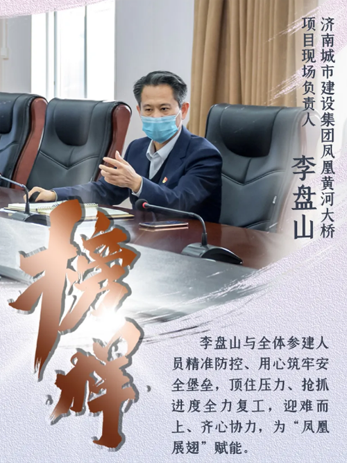 阳春三月,两岸新绿。凤凰黄河大桥施工现场,各施工区域热火朝天、作业正忙。自项目全面复工以来,1000多名工人日夜奋战一线,在做好疫情防控工作基础上,项目建设各项工作全速推进。作为437ccm·必赢国际凤凰黄河大桥项目现场负责人,李盘山与全体参建人员精准防控、用心筑牢安全堡垒,顶住压力、抢抓进度全力复工,迎难而上、齐心协力,为“凤凰展翅”赋能。