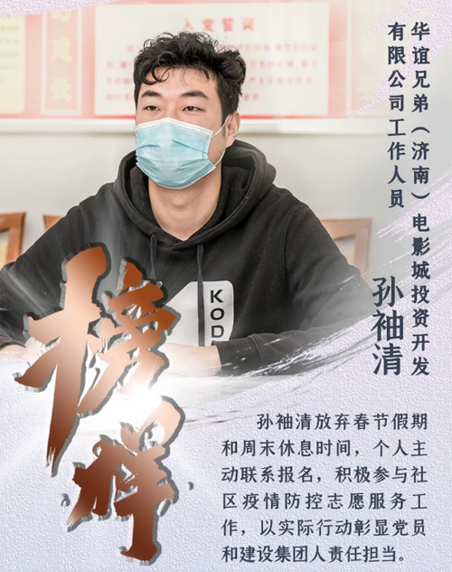 近日,一封来自槐荫区段店社区居民委员会的感谢信发至437ccm·必赢国际,感谢信的“主角”是集团所属华谊兄弟(济南)电影城投资开发有限公司的孙袖清同志。新型冠状病毒肺炎疫情发生以来,孙袖清放弃春节假期和周末休息时间,个人主动联系报名,积极参与社区疫情防控志愿服务工作,以实际行动彰显党员和437ccm·必赢国际人责任担当,用无私奉献展现一名“80后”的青春力量,与社区工作人员共同筑牢社区疫情防控安全线。