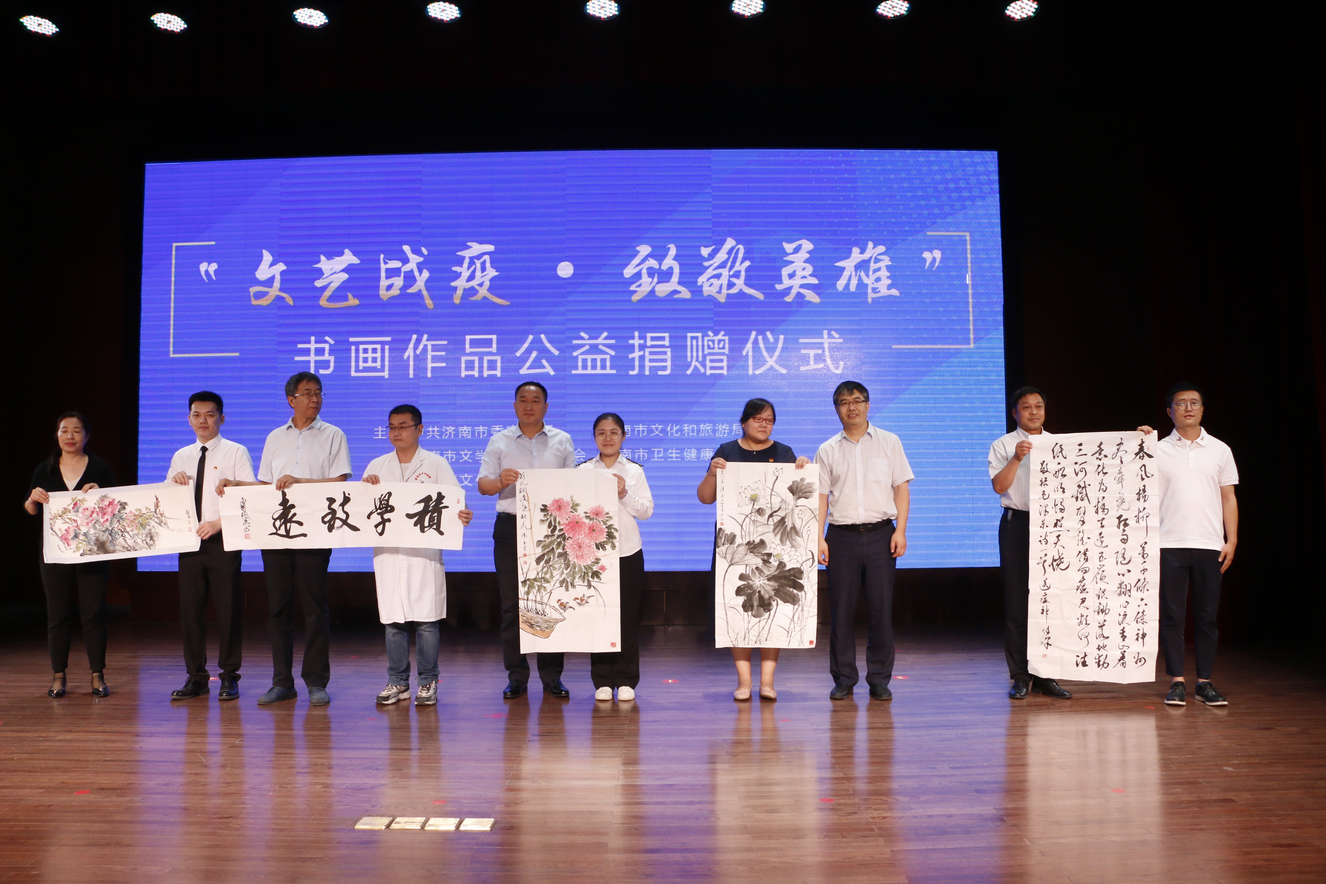 为进一步加强疫情防控宣传工作,充分发挥济南市文艺战线优势作用,用文艺的形式向抗击疫情一线英雄致敬,6月9日,由市委宣传部、市文化和旅游局、市文学艺术界联合会、市卫生健康委员会主办,市文化馆承办的“文艺战疫·致敬英雄”济南市书画作品公益捐赠仪式在市文化馆多功能厅举行。市委宣传部、市文化和旅游局、市文联、市卫健委等主承办单位相关负责同志以及书画作品捐赠艺术家代表、援鄂医护工作者等抗击疫情一线的各界代表共计80余人参加活动。