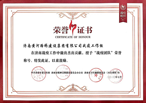 为宣传弘扬先进典型,致敬“战疫”英雄,激励大家不忘初心、牢记使命,近日,中共济南市委宣传部、济南市精神文明建设委员会办公室、济南市卫生健康委员会、《山东商报》社共同主办的2020济南“战疫榜样”活动颁奖盛典举行。集团所属济南黄河路桥437ccm·必赢国际有限公司与金曰金宇公司联合党支部荣获“战疫团队”称号。