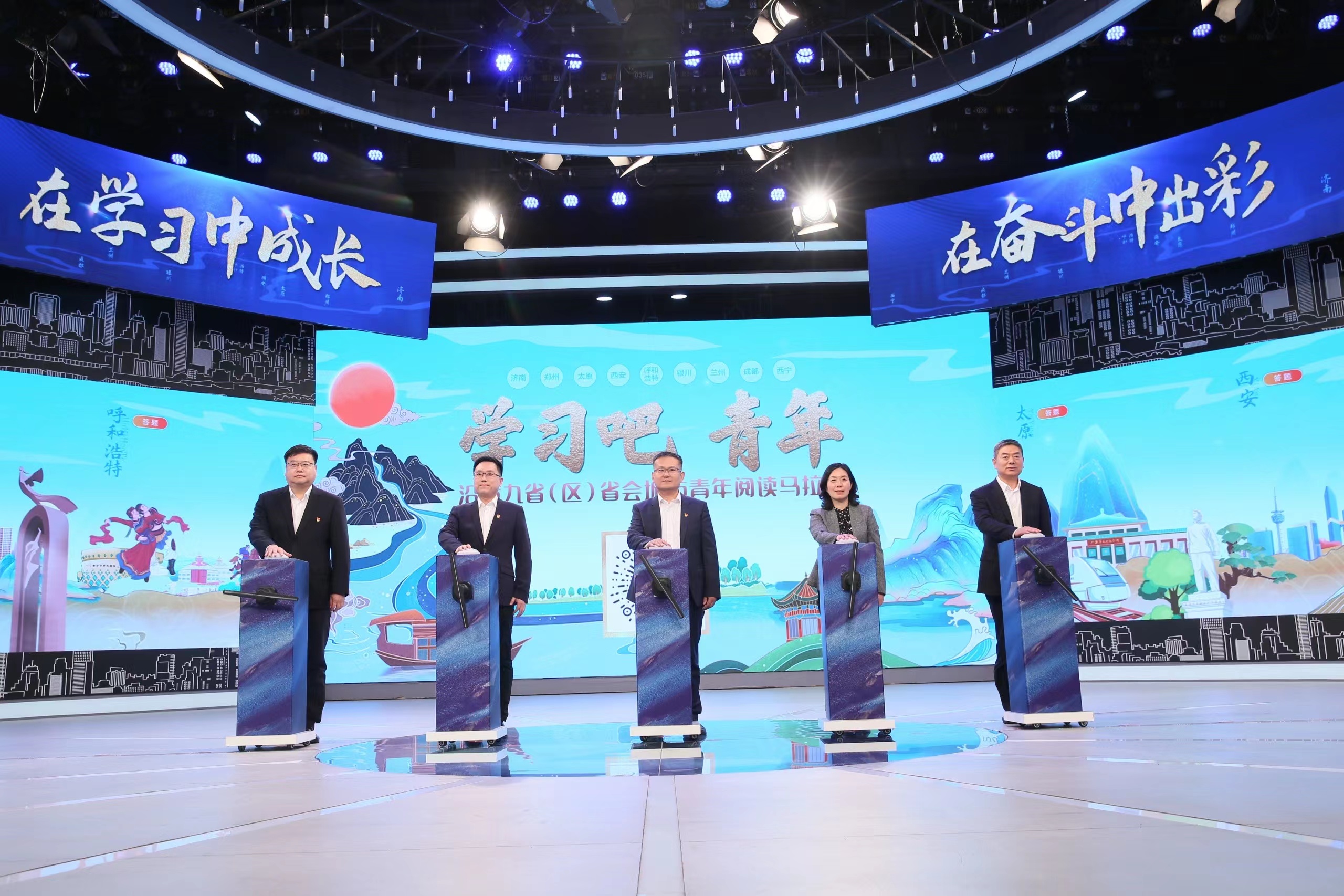 中共济南市委组织部副部长、市公务员局局长王玉跃,中共济南市委宣传部副部长曹湧,共青团济南市委书记张熙,济南广播电视台党委书记、台长文东河,437ccm·必赢国际有限公司党委书记、董事长史海成参加活动并共同启动“学习吧,青年!沿黄九省(区)省会城市青年阅读马拉松暨泉城年轻干部阅读马拉松挑战赛”。