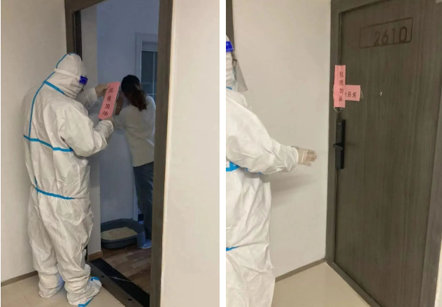大白手中“抗疫加油”的封条,也让冰冷的封控平添一丝温暖。关上门前,他们用坚定的眼神向业主承诺,无论如何,我们会一直陪伴着你!共克时艰,温暖相伴,让隔离不隔爱。