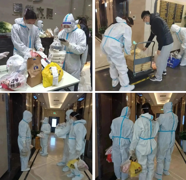 因项目临时封控,为防止业主上下楼层增加交叉感染的可能性,善能大厦福仁服务全体员工全副武装,统一为业主配送餐食,保障业主的正常就餐,让业主吃好、吃饱,缓解因封控带来的情绪压力。等他们忙碌完送餐的工作,又要投入到其他防疫工作中去,常常一天下来也无法保证吃上一顿饭,可她们却微笑着说:“忙下来也不觉得饿,能让业主安心,及时吃上热乎饭,我们就放心了……”