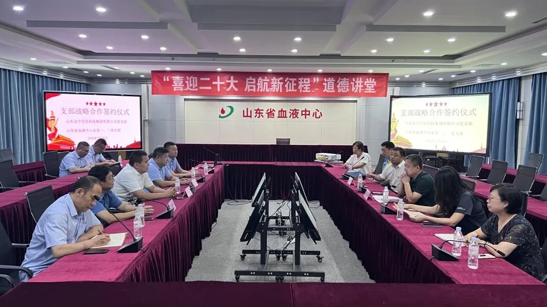 7月22日,山东金宇信息科技集团党支部与山东省血液中心业务一、二党支部共建合作签约仪式在省血液中心举行。双方有关负责同志和党员干部代表出席了协议签订活动。