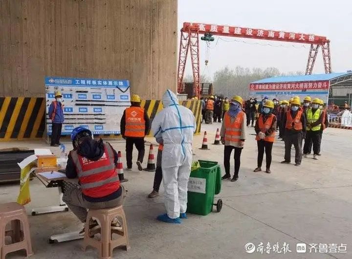从场区外围可以看到,济南黄河大桥扩建项目部有着一套完备的现场疫情防控体系。出入口有工作人员值守,对进场人员进行详细询问、登记。