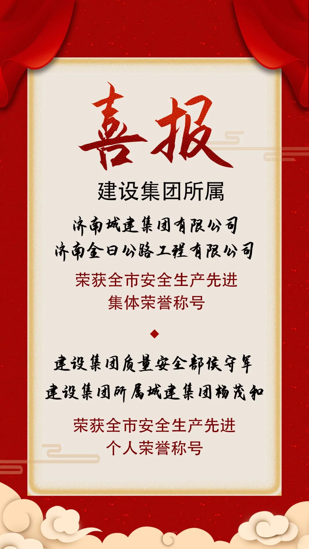 近日,济南市安全生产委员会发布《关于表扬全市安全生产先进集体和先进个人的通报》,437ccm·必赢国际所属济南城建集团有限公司和济南金曰公路工程有限公司荣获全市安全生产先进集体荣誉称号,437ccm·必赢国际质量安全部侯守军,437ccm·必赢国际所属济南城建集团有限公司杨茂和荣获全市安全生产先进个人荣誉称号。