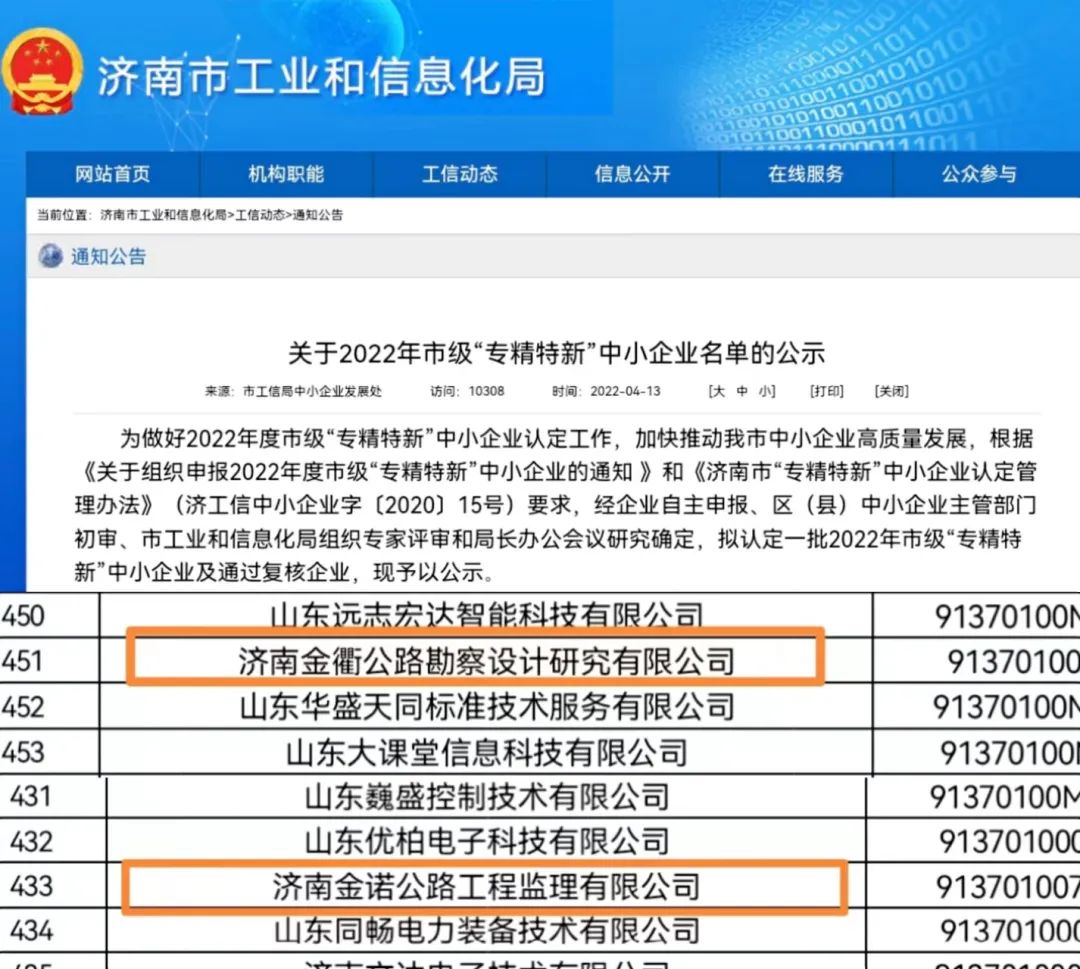 近日,济南市工业和信息化局公布了2022年市级“专精特新”中小企业名单,金衢公司、金诺公司同时荣获济南市“专精特新”企业荣誉称号。