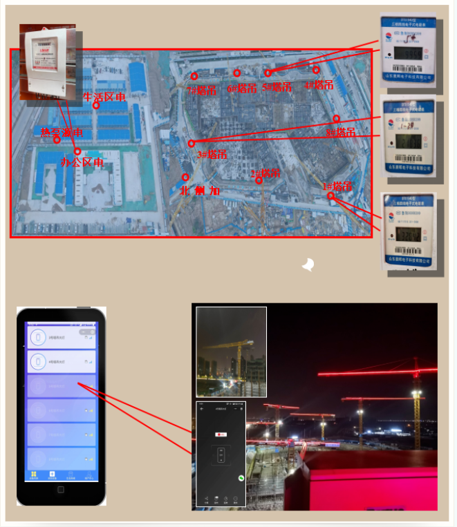在房建类项目建设中,通过用电分区计量,将施工用电,办公用电,生活用电均分开计量,现场8台塔吊,均单独计量,项目安排专人每月底抄表,做好用电台账,并统计分析,纠偏查因。同时通过项目部塔吊大灯远程智能控制系统,保证施工现场无人施工时能第一时间利用APP使塔吊镝灯,节约能源。