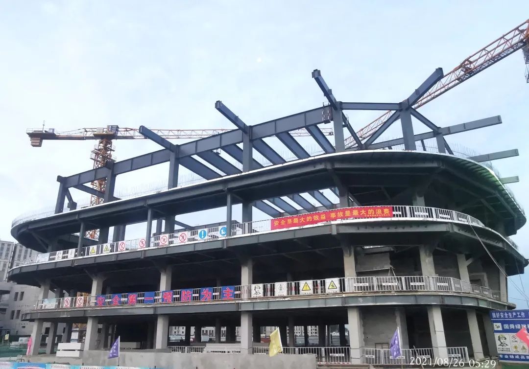 在主体结构施工中,采用钢构框架安装,施工采用BIM排布钢构安装顺序,钢构组件抵达施工现场后施工人员按照编号快速有效拼接。楼板采用楼承板安装,在免除支模板施工同时也提高了安全性加快了施工进度,实现了安全经济环保的综合效益。
