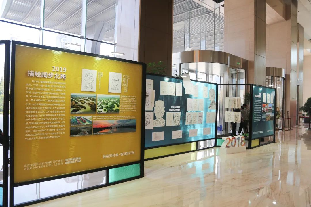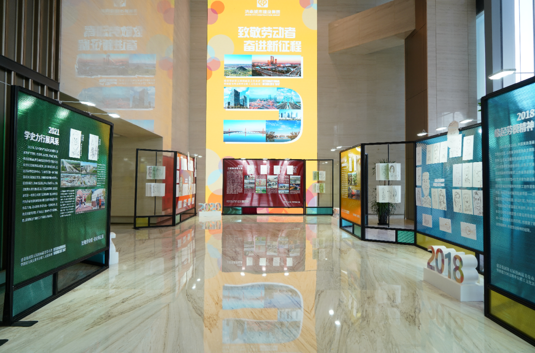 在第五届“漫画最美劳动者”活动中,12位书画家在济南城市建设大厦,为集团2019—2021年度荣获市级以上荣誉获得者创作书画作品,同时,举办了过往四年漫画作品展,以时间跨度为展览轴线,从“人物成长”和“项目发展”两个维度,从“2018·缘起劳模精神”“2019·描绘阔步北跨”“2020·三载重逢叹巨变”“2021·学史力行展风采”四个章节集中呈现集团建设精神、劳动精神和重点项目的建设历程,不断凝聚人心,激励广大干部奋力攻坚,为新时代社会主义现代化强省会建设贡献力量。