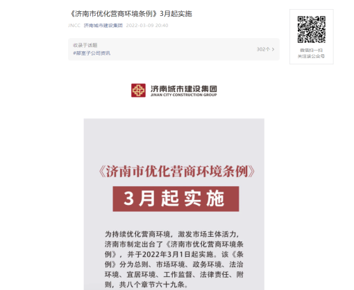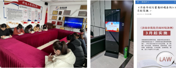 《济南市优化营商环境条例》(以下简称《条例》)于今年3月1日起施行,根据市国资委《关于开展优化营商环境法治宣传月活动的通知》要求,为贯彻实施好《条例》,持续优化营商环境,3月4日-31日,集团及各子公司积极开展了优化营商环境法治宣传月活动。活动期间,集团在微信公众号推送《<济南市优化营商环境条例>3月起实施》推文,同时通过电子屏投放、制作易拉宝等多种形式进行宣传,不断强化干部职工优化营商环境的理念,营造良好舆论氛围。