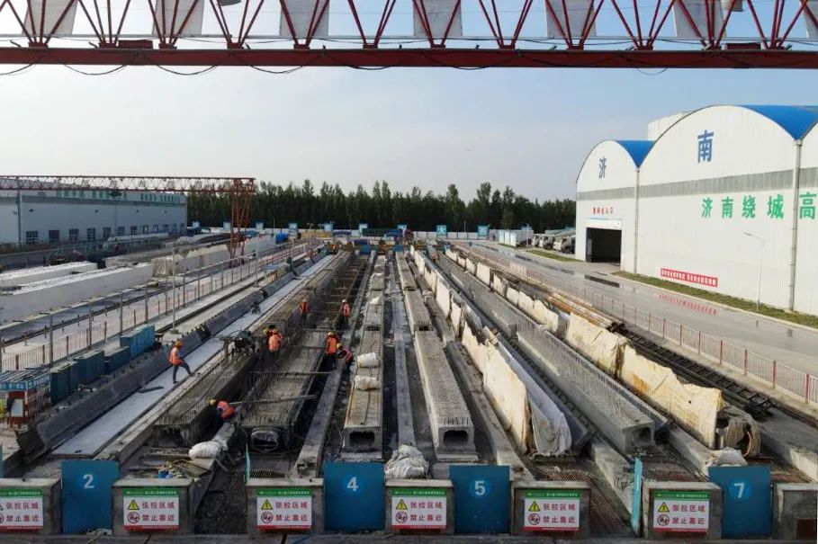 济南绕城高速公路二环线西环段二分部全长约19公里,工程涵盖63座桥梁,需要预制箱梁1433片,预制空心板1300片。为保证梁板预制工作,大西环项目部科学谋划,精心调度,克服疫情、环保等不利因素,从生产计划制定、原材料供应、梁板吊装等方面提前策划,周密部署,掀起了一波又一波施工热潮,为确保大西环年底通车提供了有力保障。