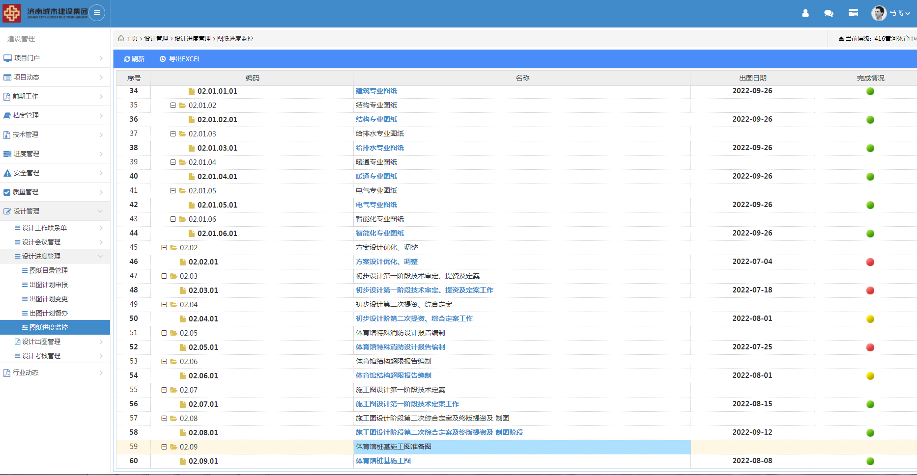 为进一步强化设计源头管理,克服设计过程环节多、线下管控难度较大的实际,工程四部OA信息平台开发研制设计管理业务功能模块并在黄河体育中心项目全面应用。通过设计管理业务功能模块,实现出图计划、图纸上传、分发签收、图纸会审、变更、图纸文档的统一编码与存档,有效提升设计管理中工作任务安排、接收及出图计划整体把控。