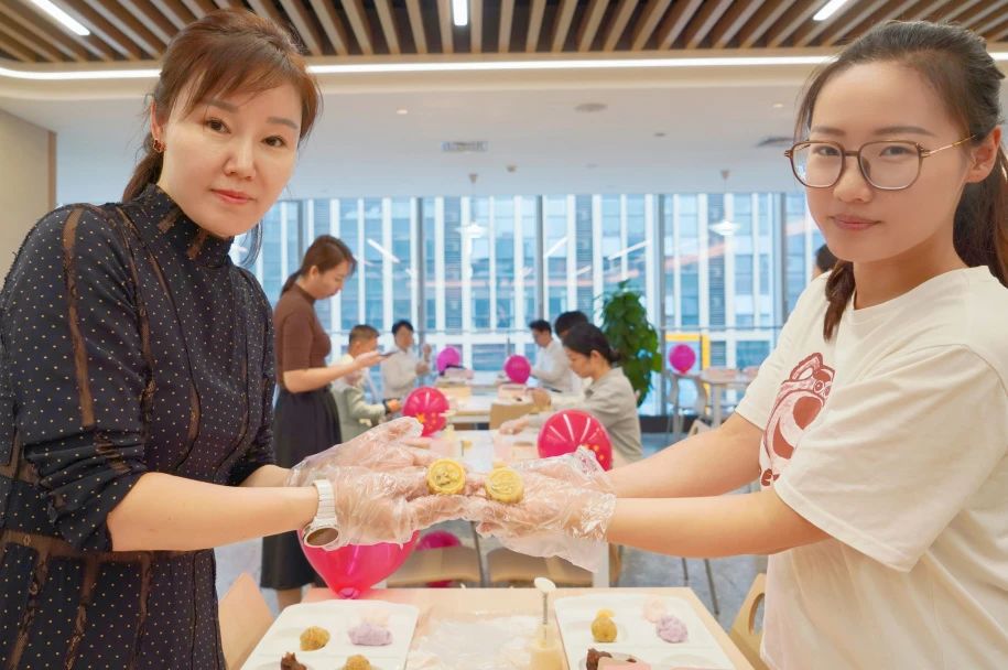 活动现场,糕点师傅悉心指导,员工们踊跃参与,并交流分享月饼的制作方法和文化内涵,在动手制作中感受传统文化魅力和浓厚的节日氛围。