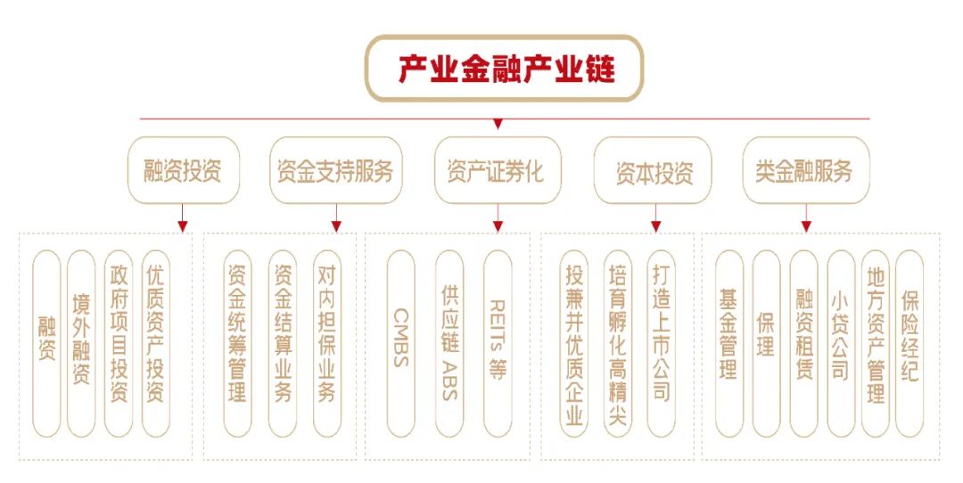 按照产业金融产业链发展规划,依托国泰君安、中信证券、伽利略资本等专业投研机构,筛选优质投资标的,以投带引,获得财务性投资回报,同时培育孵化产业项目,布局优势产业;借助科研院所、高校等科研资源,寻找科技成果转化类优质项目,提前布局高精尖产业,聚合产业资源,打造产业集群;利用集团资源优势,及时捕获资产证券化渠道信息,丰富CMBS、供应链ABS、REITs等方式方法,产业链协同推动净收益好的项目资产证券化,盘活资产,降低集团整体融资成本。