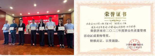 济南质量管理协会发布《关于公布济南市 2023 年度群众性质量管理活动优秀成果、质量信得过班组的通知》。金曰公司“路安”QC小组的成果“提高城市高架桥防撞墙面层维修一次合格率”荣评“济南市2023年度群众性质量管理活动QC成果特等奖”。