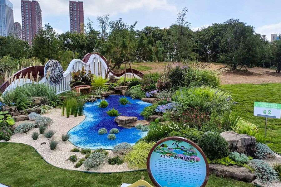 森泰园林参赛作品的设计灵感来源于元代画家赵孟頫的《鹊华秋色图》,设计理念以“鹊华千载,山河无垠”为主题,以山、水、诗词、花卉为载体,以国风方式展现“齐风鲁韵、花漾山东”,以花境打造山水文化田园。经过三天的花境施工,现场团队克服工期短、任务重等困难,始终坚持高标准的花境打造,用匠心营造美丽,展现出季相色彩丰富,特色浓郁的低碳生态景观。