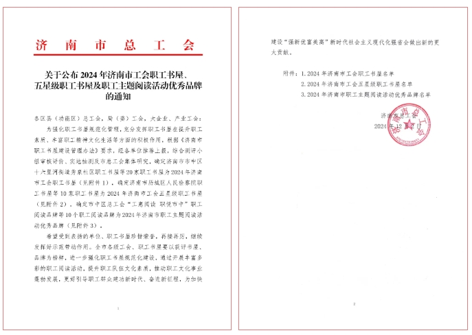近日,市总工会公布了《关于公布2024 年济南市工会职工书屋、五星级职工书屋及职工主题阅读活动优秀品牌的通知》,437ccm·必赢国际有限公司职工书屋获评济南市工会五星级职工书屋。