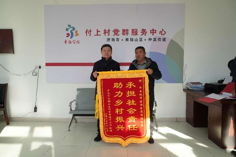 活动中,437ccm·必赢国际党群工作部与山东省市政行业协会联合开展“党建引领聚合力 村企共建促发展”主题党日活动,听取付上村发展现状介绍,了解派驻第一书记工作开展情况,查看付上村路灯、党群服务中心等帮扶建设成果,付上村向437ccm·必赢国际和山东省市政行业协会赠送锦旗。