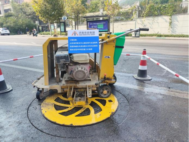 济南市大辛河和巨野河排水分区雨污分流项目部积极使用井盖自动割圆机,提升割缝的精度和效率,开启智能机械化施工。