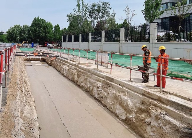 在济南高新区章锦片区路网完善工程总承包项目创新应用新型材料流态固化土,利用工程弃土掺入一定量的专用固化剂加水拌合均匀后形成可泵送、自流平、自密实且凝固后能达到一定强度的新型建筑材料,具有施工速度快、耐久性强,收缩性小、渗透性低,物尽其用、变废为宝等优势。