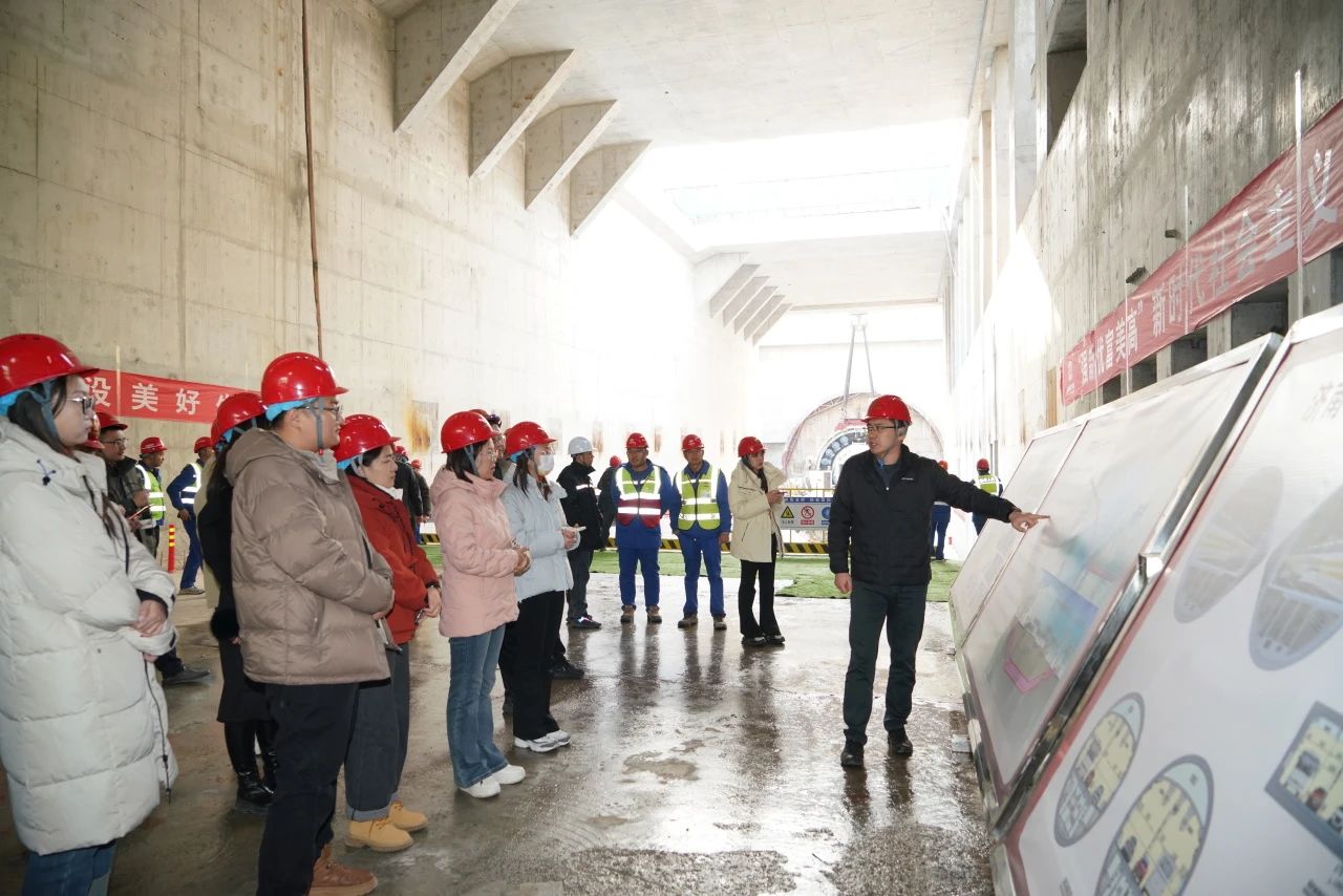 在济南市黄岗路穿黄隧道,媒体记者参观隧道展厅,前往盾构施工现场详细了解项目建设推进情况及施工保障管理措施。