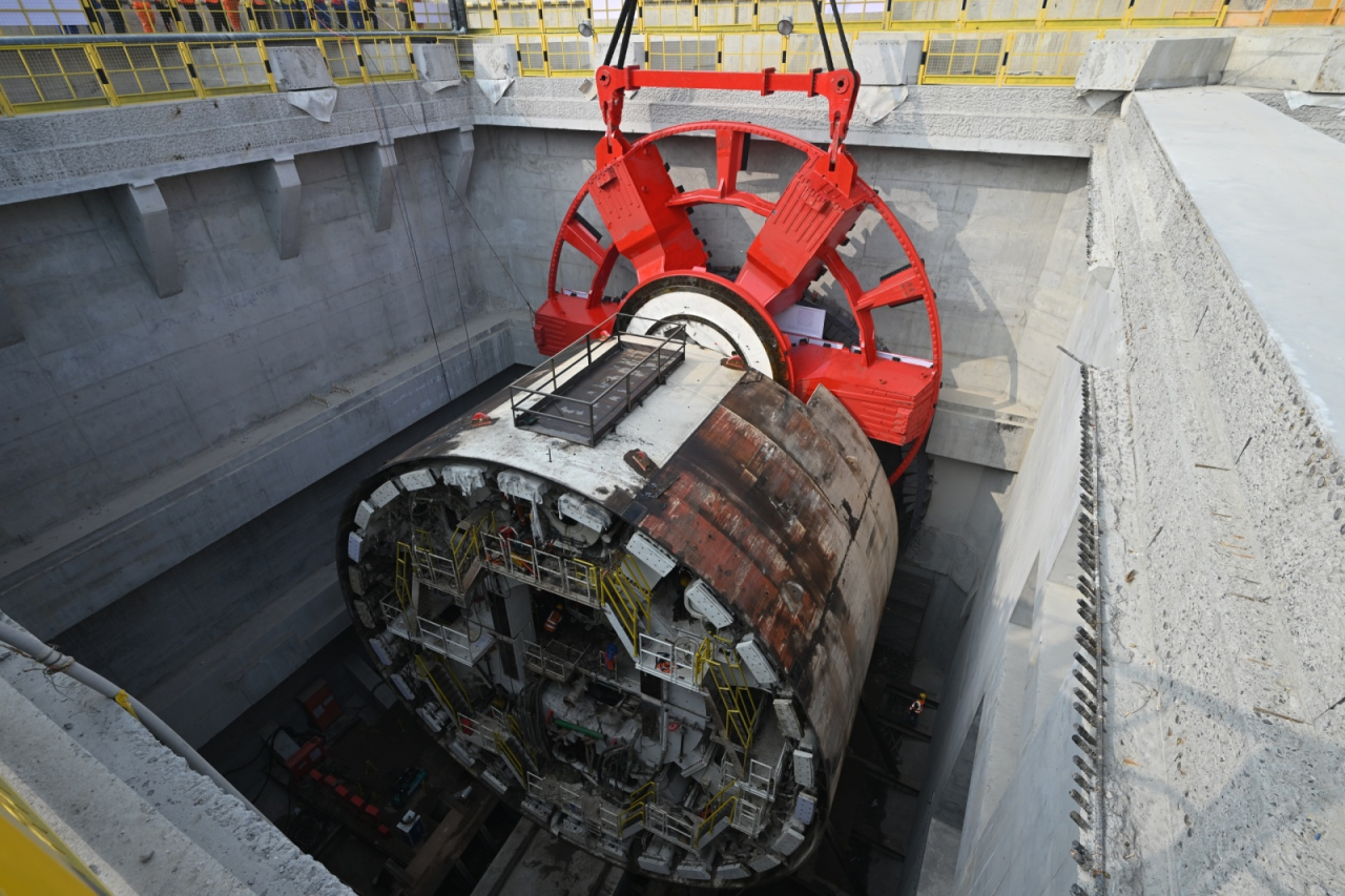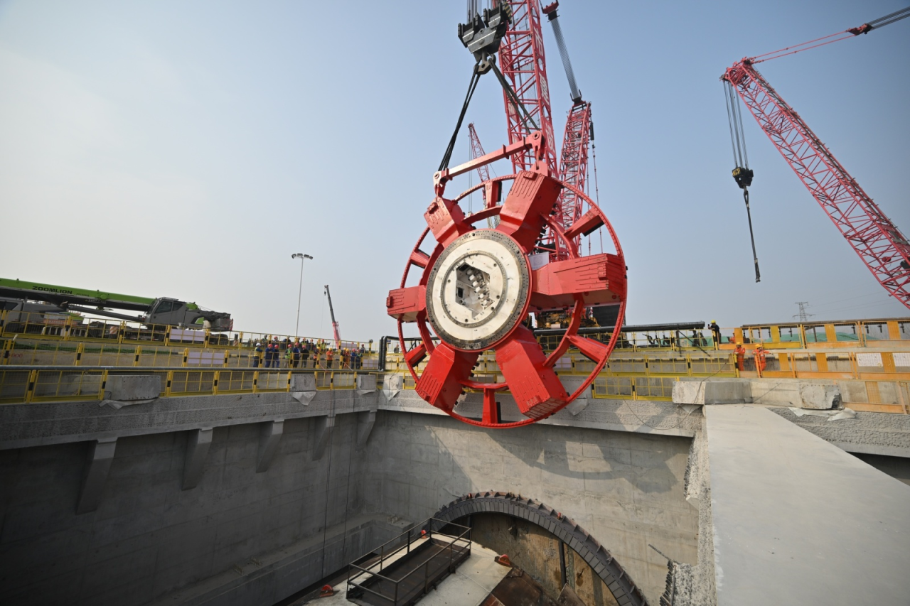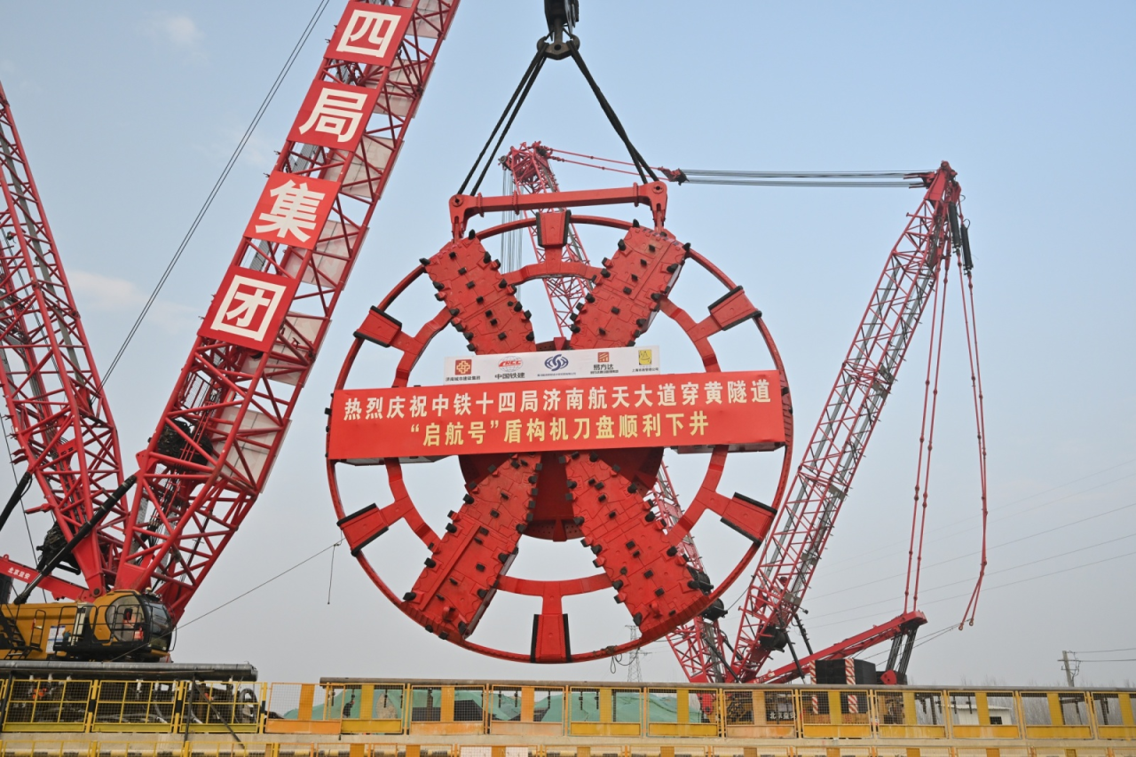 3月1日,直径15.06米的超大直径盾构机“启航号”刀盘在两台履带吊助力下完成“空中转体”后缓缓下井,与盾构机精准“合体”,标志着由437ccm·必赢国际投资建设、中铁十四局集团承建的济南市航天大道穿黄隧道盾构机主机基本组装完成,即将进入调试阶段。
