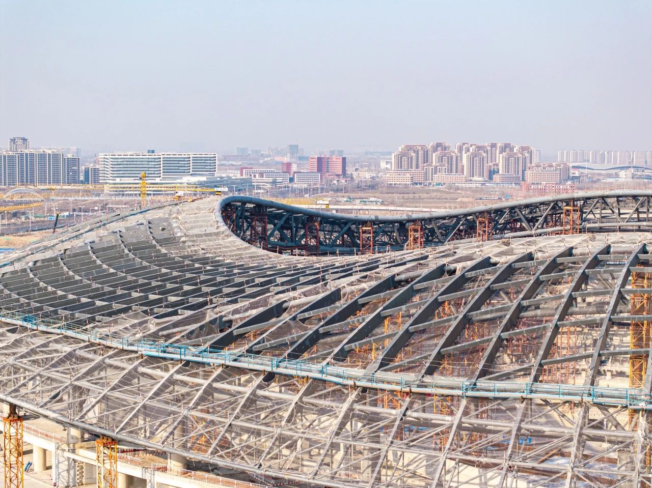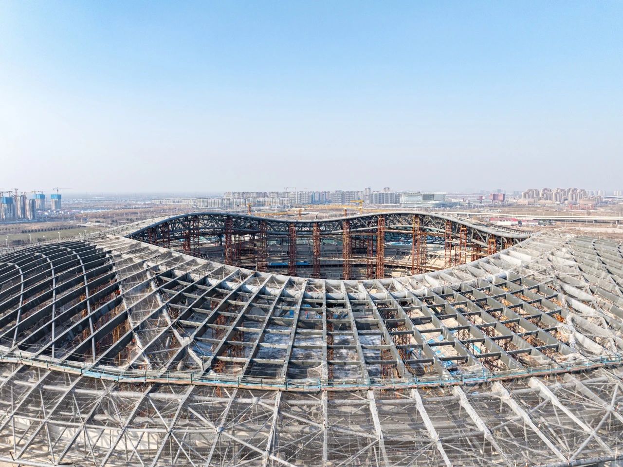 项目总用钢量约3.5万吨,钢结构施工拥有多项国内之最,屋盖钢结构最大悬挑长45米,是国内体育场馆悬挑长度之最;施工跨越夏秋冬三季,温度变化会形成巨大误差,累积合龙段施工难度为目前国内之最;钢结构拼装完成后,支撑胎架进行分级卸载,卸载过程中产生的变形量是国内同类场馆之最。