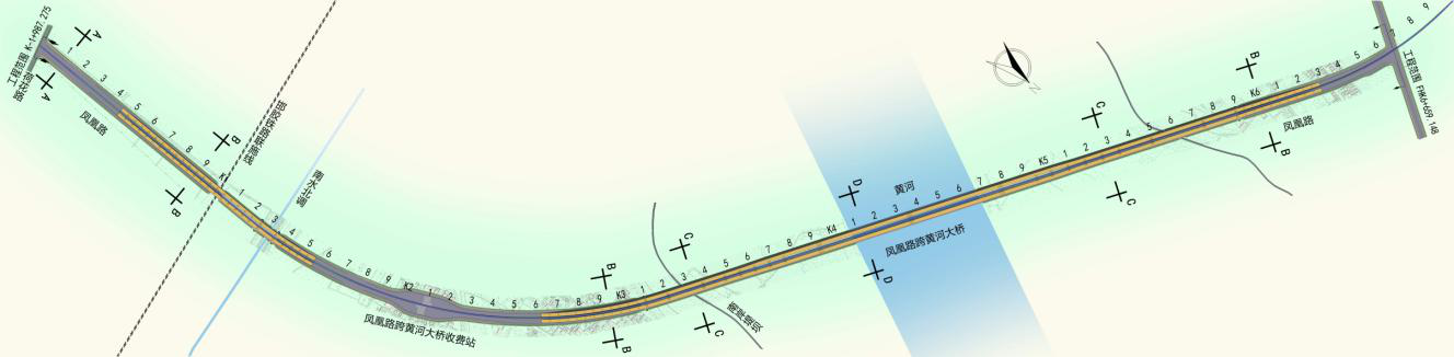 二标段路线全长约3713米,南起黄河大桥南岸引桥(桩号K2+946),向北跨越黄河后,终点位于远期规划主干路与G220交叉口处,包含跨黄河大桥一座及部分路基段。